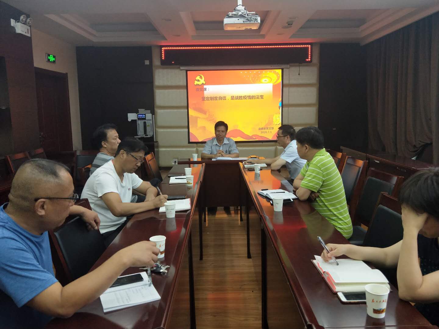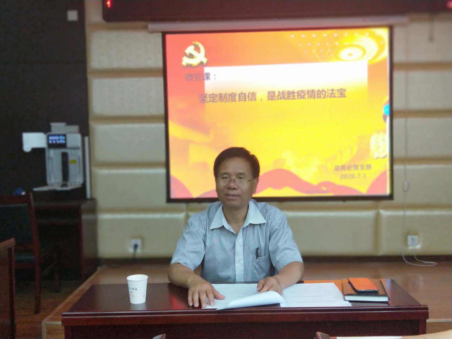 7月1日上午,总务处党支部全体党员在实训楼一楼会议室举办专题微党课。总务处党支部书记郭宝东同志主持会议,全体支部党员集体学习。